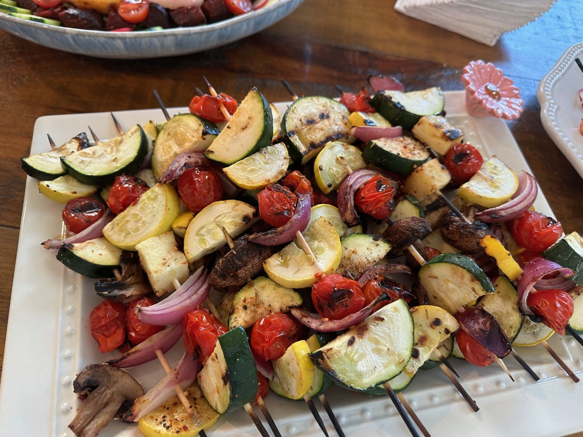 In Frankford, it was grilled Veggie Skewers loaded with tomatoes, mushrooms, zucchini, squash and onions, along with grilled Jumbo Shrimp and Marinated Chicken kebobs, a Greek Pasta Salad with lots of garden veggies and a Grilled Peach and Roasted Beet salad.