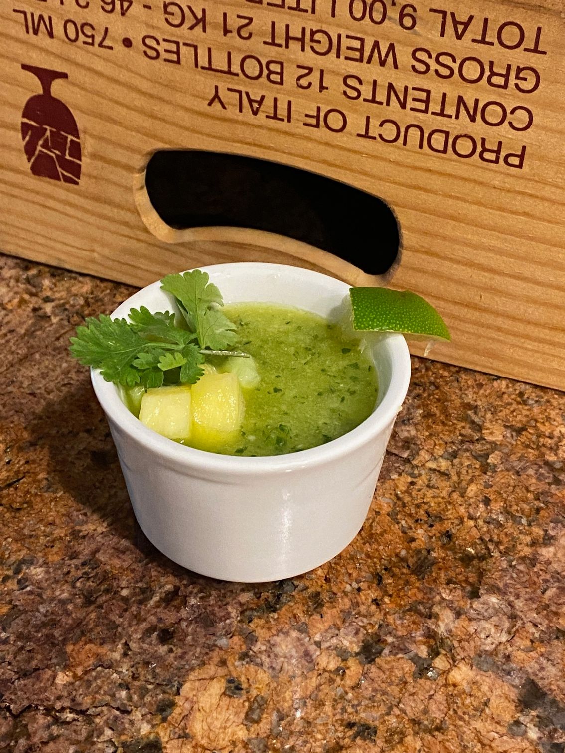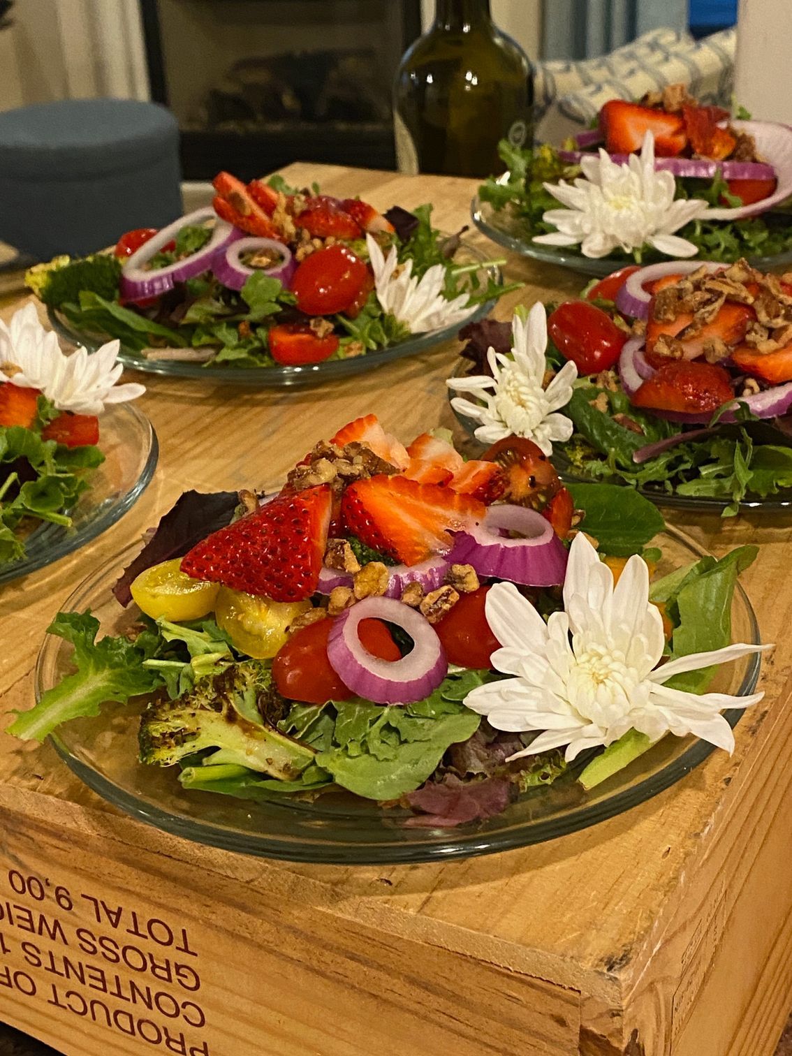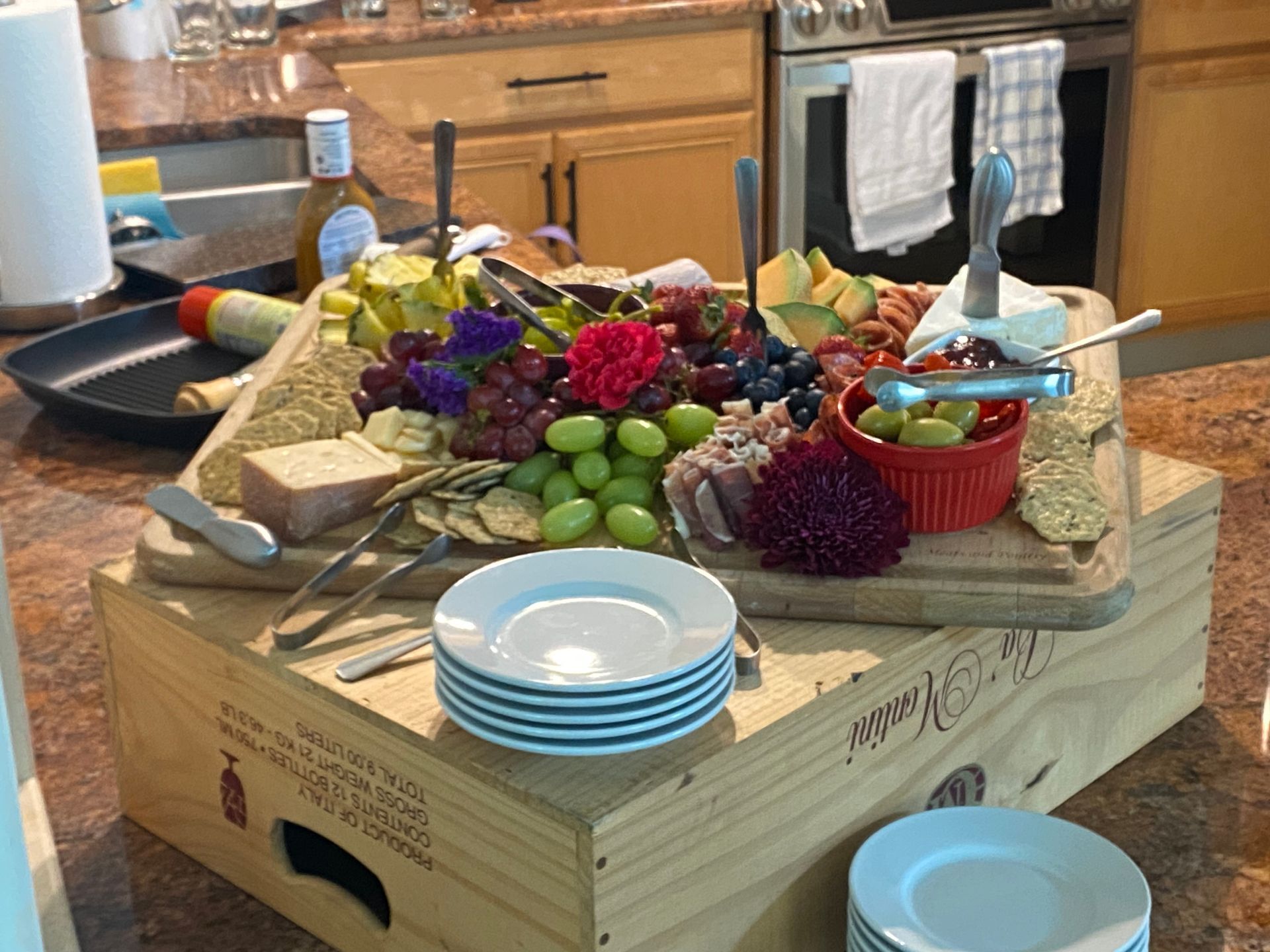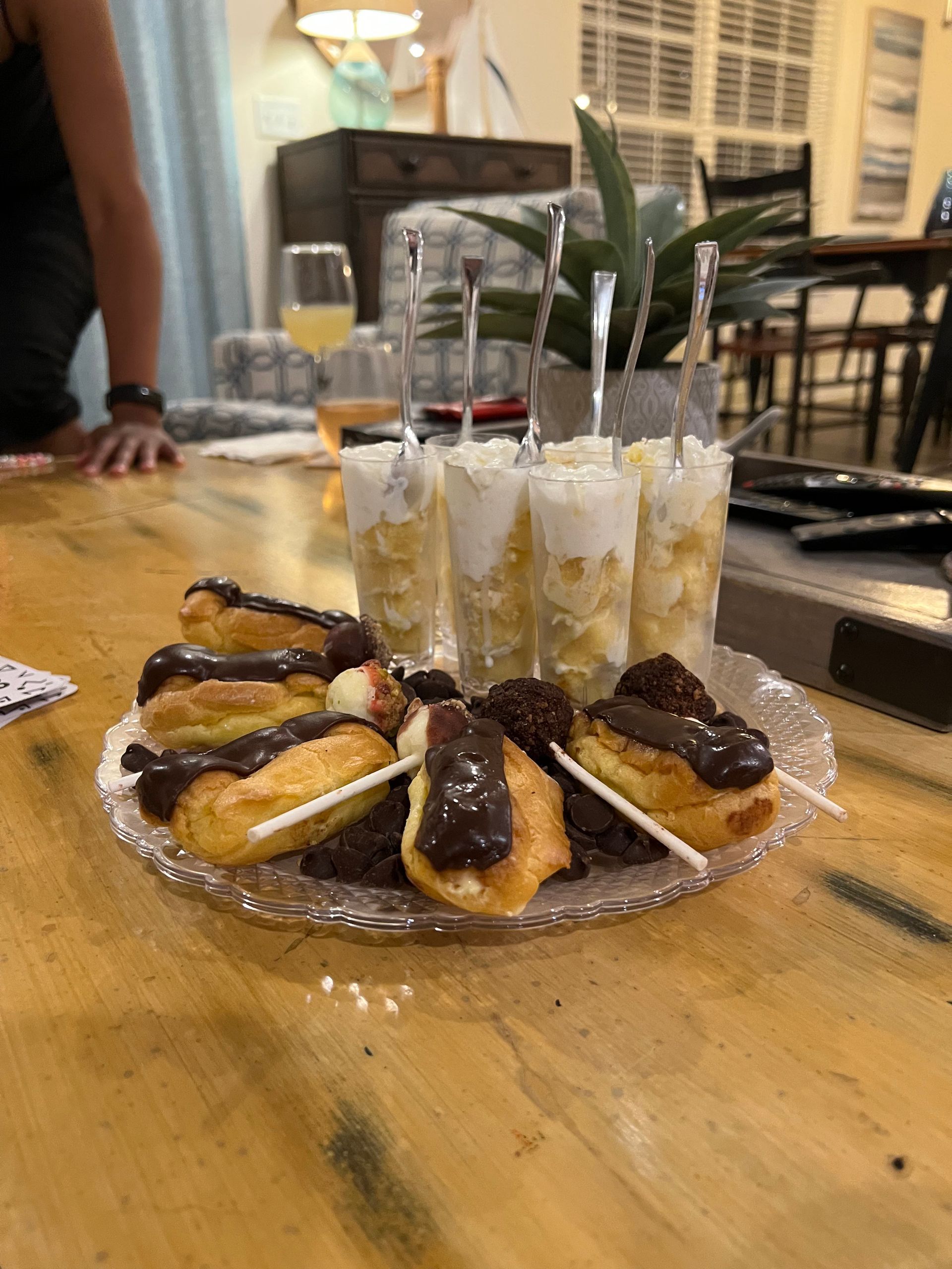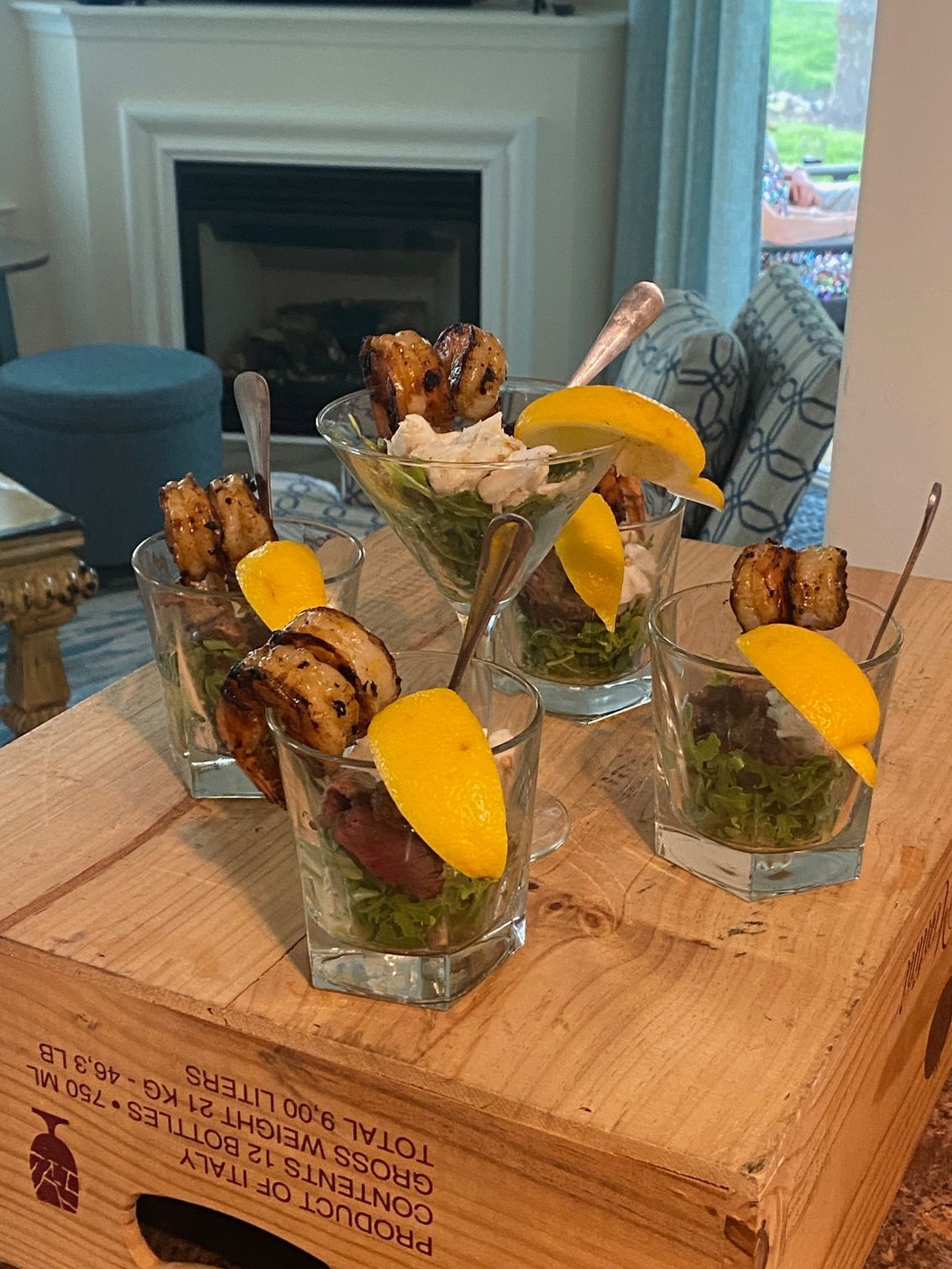 While my husband and I were setting up, the ladies started coming downstairs one by one, and they were all fabulously dressed for a special evening. As the wine and well deserved compliments started to flow, we began to get to know our clients and learned that they all worked together at a school. We started the evening off with a beautiful charcuterie board on the porch, followed by surf & turf martinis along with savory sausage & pepper skewers. As I served, I got to hear tidbits of conversation, and was blown away by the praise and admiration that they shared for each other. As the night went on, I noticed one or two ladies excuse themselves and return wearing more laid back attire; it was time for comfort and dinner. We moved to the dining area with a cucumber pineapple gazpacho then a roasted broccoli salad. The conversation, throughout dinner of sautéed chicken breast and jumbo shrimp in a lemon basil sauce over home made pasta and seared garlic green beans, continued to be uplifting and fun. The stories that I enjoyed were so refreshing, there was not any griping or negativity from these lovely people. In a job that I can only imagine is trying, frustrating and challenging, I did not hear any complaining from them. They laughed, praised their students and best of all, celebrated each other. As we served some sweet bites, I noticed some had changed into pajamas. We took our leave as they settled in and began to play some games.