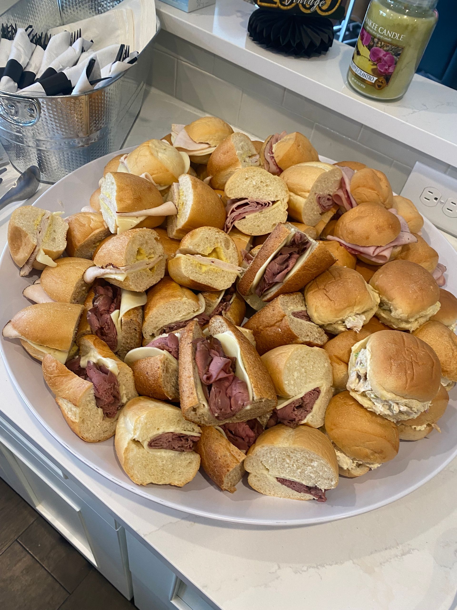 Mini Sandwiches including Tenderloin, Roasted Pepper and Horsey Sauce, Chicken Salad, Turkey & Cheese with Pesto, Veggie & Hummus, Cucumber & Veggie Cheese Spread, Ham & Pear with Cheese $4/person