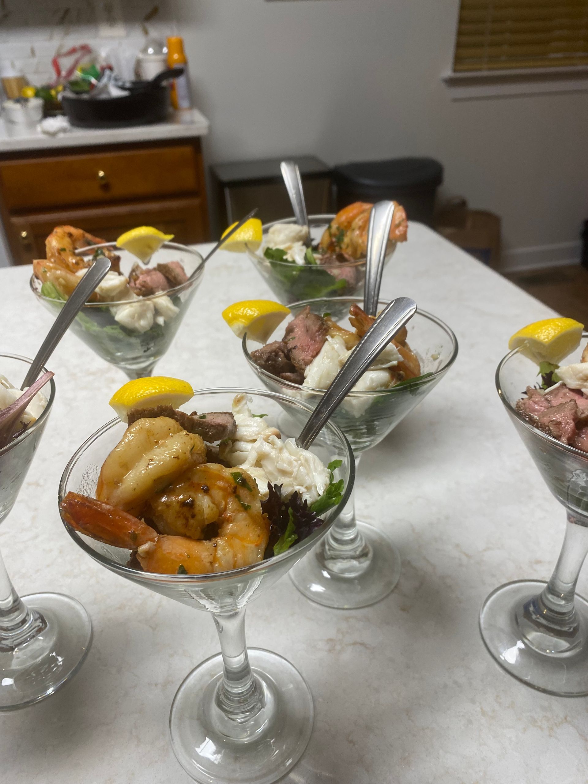 Surf & Turf Shooters, Slice of Tender Beef and Jumbo Lump Crab over Greens with a light dressing in individual cups $12/Guest