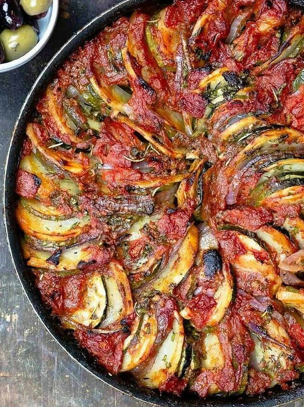Briam Layered potatoes, zucchini, onion & tomatoes with lots of fresh herbs